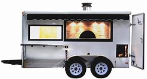 "Mobile wood-fired pizza trailer with authentic oven, does weddings"